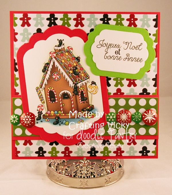 Love what you did with the gingerbread house, Vicky! I can't wait to play with this one myself. :-D wonderful die cutting on the image and sentiment and the mats for those are delightful in the traditional Christmas colors.