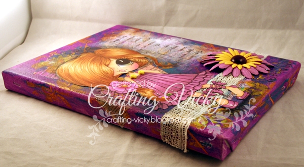 I used all sorts of acrylic paints on this. I added some lace and a recollection flower with some bling. The sentiment is a Unity stamp - Courage is my strength stamp.